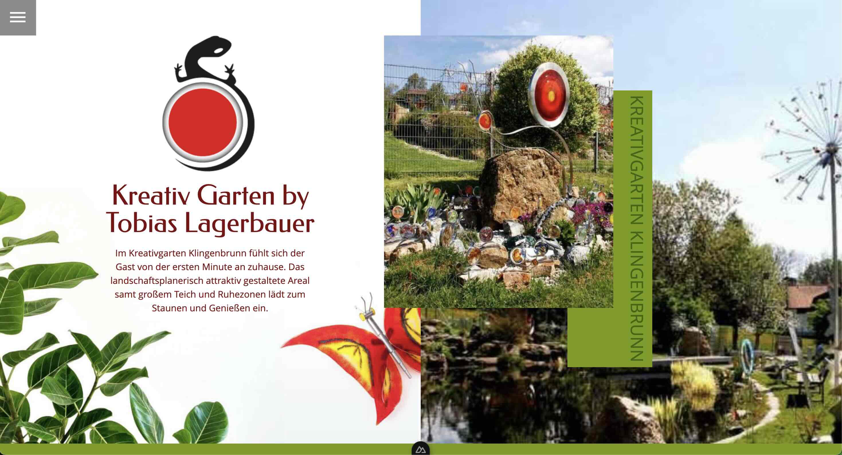 Im Kreativgarten Klingenbrunn fühlt sich der Gast von der ersten Minute an zuhause. Das landschaftsplanerisch attraktiv gestaltete Areal samt großem Teich und Ruhezonen lädt zum Staunen und Genießen ein: Auf einem urzeitgeformten Bayerwaldstein hat sich eine Libelle niedergelassen, deren gläserne Flügel irisierend im Sonnenlicht glitzern, am Ufer quakt ein Metallfrosch und hoch oben am Zaun thront, mehr putzig als grimmig, ein drahtiger Drache. Tobias Lagerbauers „Geschöpfe“ sind mit viel Liebe gearbeitet, schmücken Haus und Garten gleichermaßen und finden in so manchem Besucher bestimmt schnell einen neuen Besitzer.